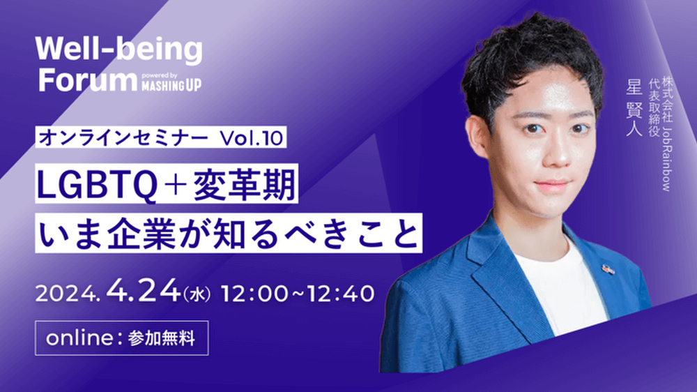 4月24日(水)12時より、Well-being Forum オンラインセミナー Vol.10「LGBTQ+ 変革期 いま企業が知るべきこと」をオンライン開催します。